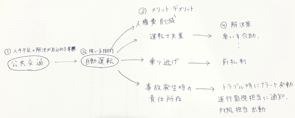 国家一般(大卒)のデジタル・電気・電子では、割と具体的なお題が与えられます。そのお題について、1つの分野や事柄を選びそのことについて、メリットやデメリット、問題点を挙げ、それらの解決策を考えます。
